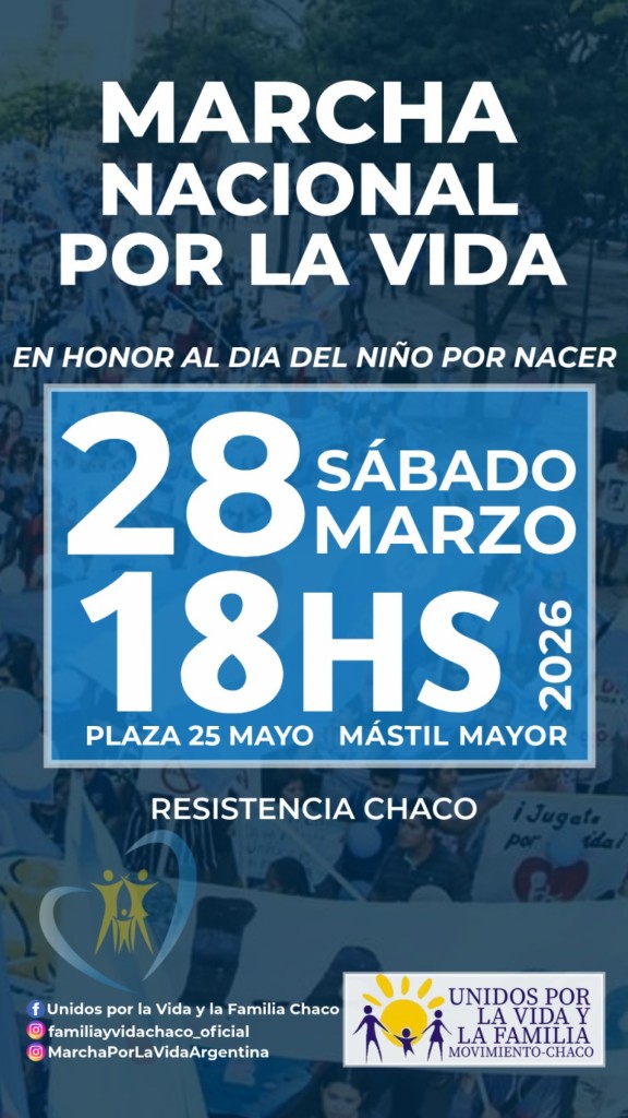 La Marcha Nacional por la Vida en honor al Niño por Nacer que fue el pasado miércoles 25 del presente mes, en la capital chaqueña se realizará ésta tarde desde las 18 horas en la Plaza 25 de Mayo y la concentración será en el mástil central para luego dar comienzo a la undécima marcha.